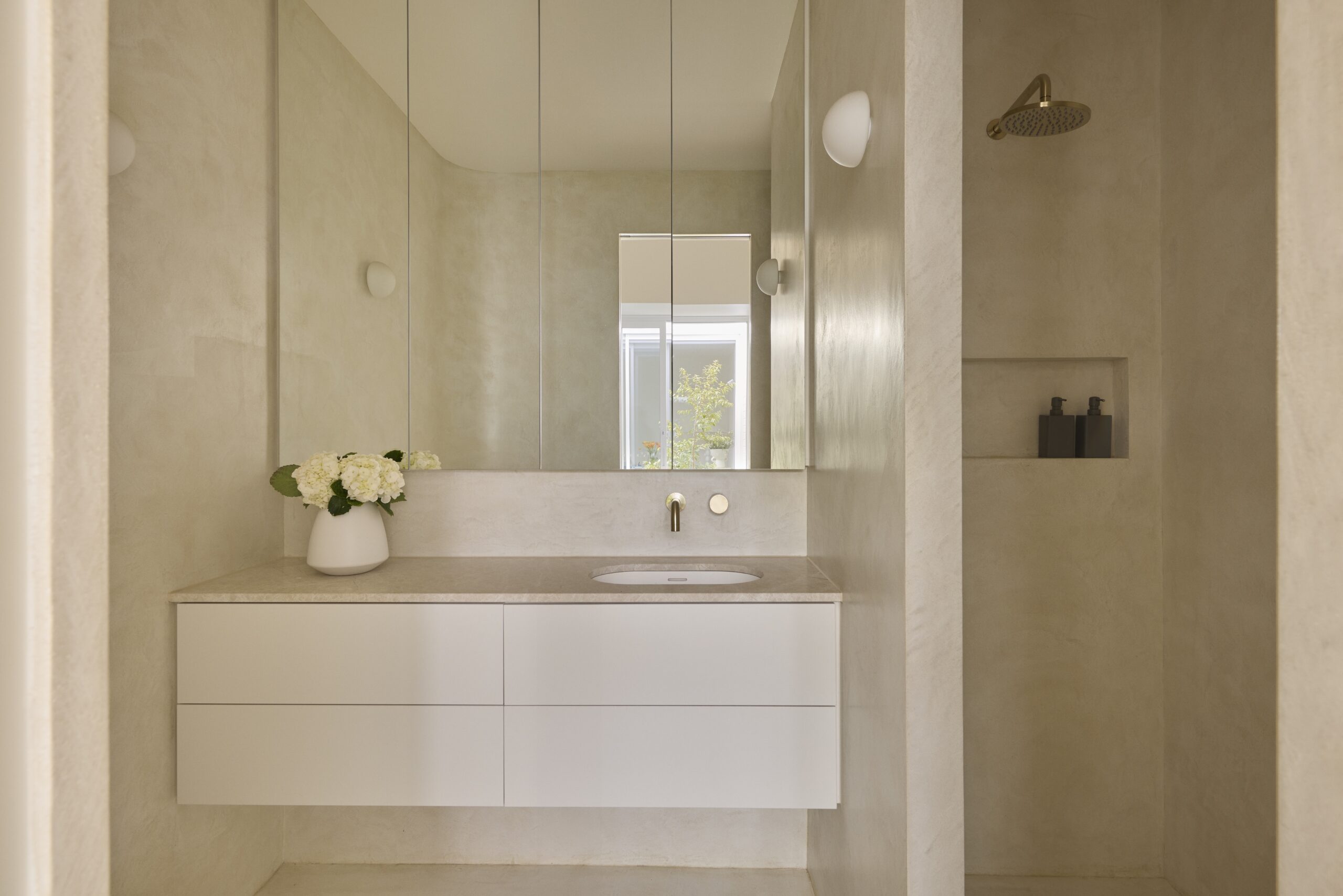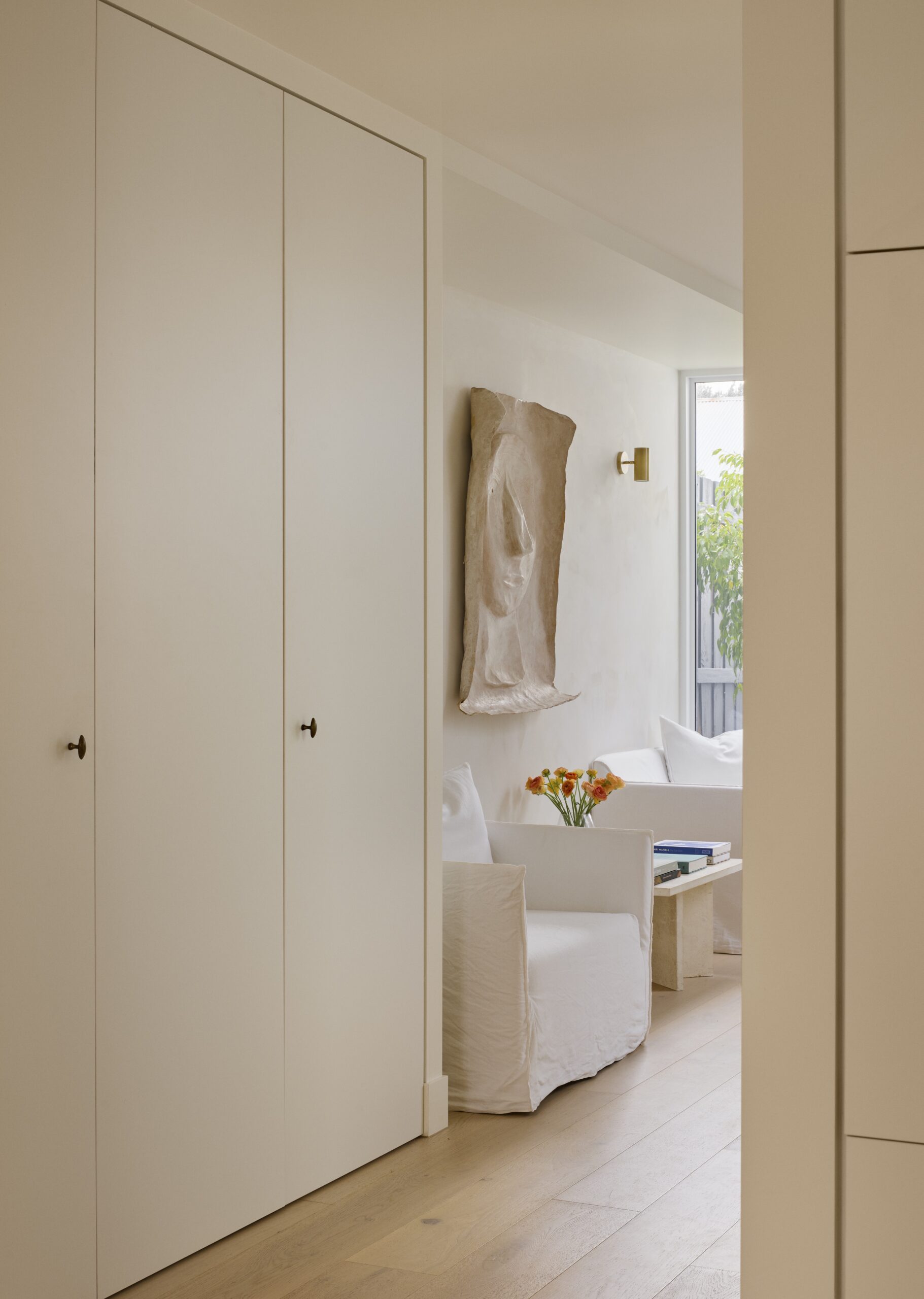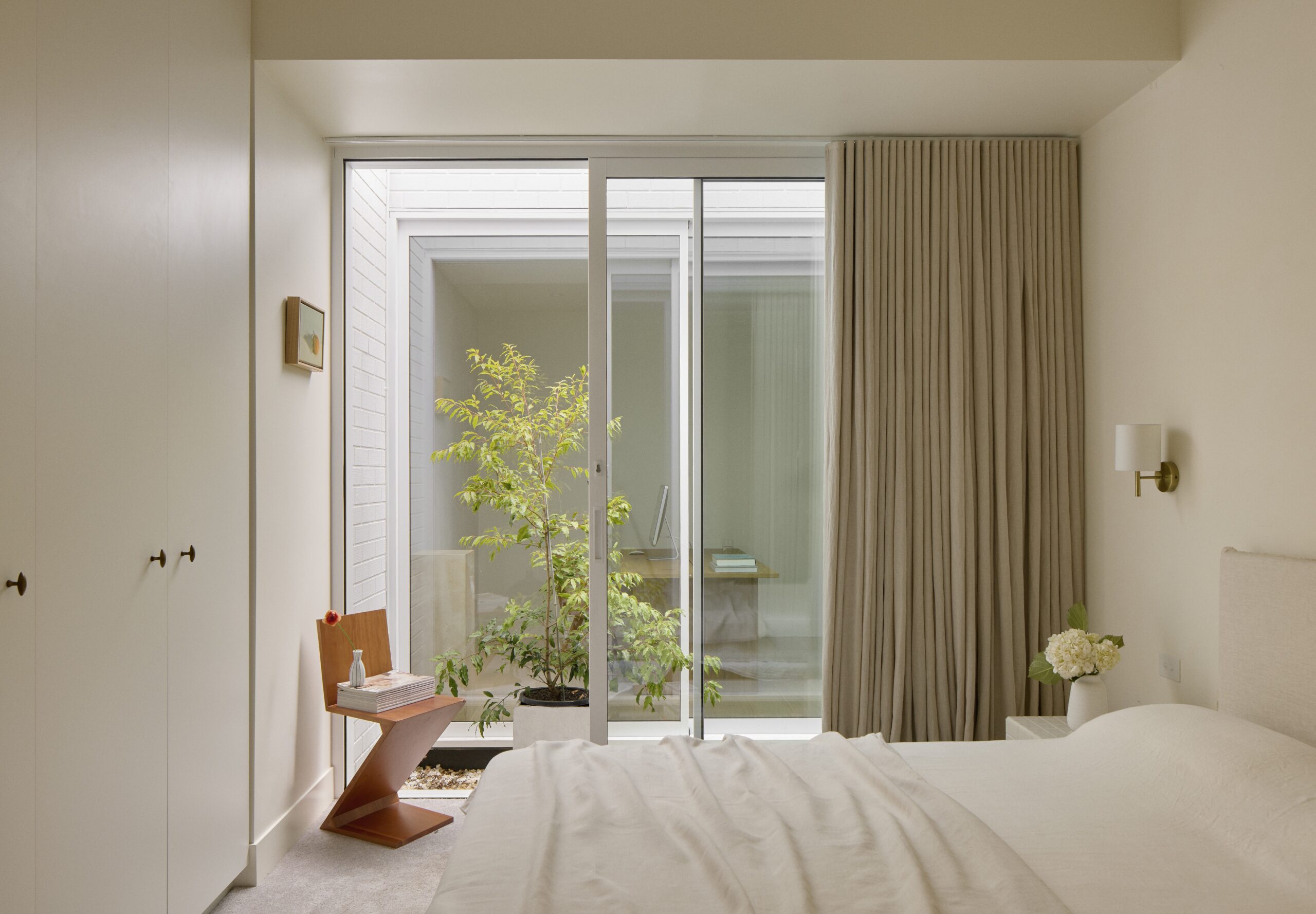 A former 1950s extension has been removed and replaced with a considered single-storey addition that maximises space, light, and long-term value. Floor-to-ceiling glass doors flood the rear living areas with natural light, while a tranquil internal courtyard with established maple trees sits between the bedroom and study, bringing greenery, privacy, and a calming seasonal rhythm indoors.